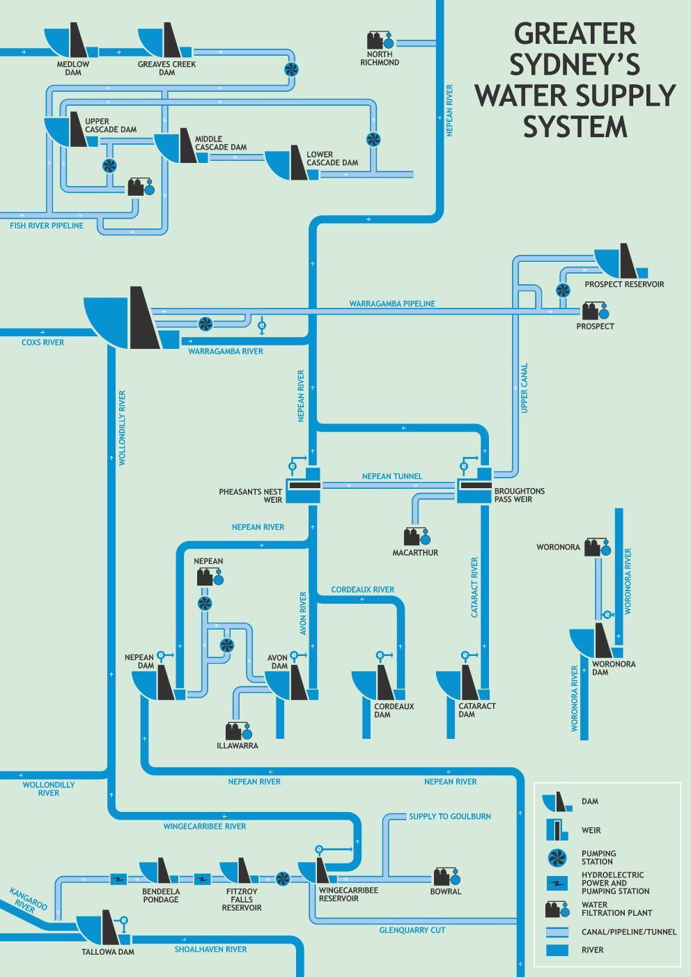 Greater Sydney's water network has many dams and reservoirs forming the network. The great benefit of an interconnected network is the ability to substitute water sources. The image below courtesy of Sydney Water shows how the Greater Sydney network is setup. This of course is supplemented by further downstream reservoirs with interconnecting trunk mains around Sydney.