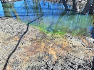 An den auslaufenden Quellwässern bilden sich häufig schillernde Häutchen. Es sieht dann so aus, als ob Öl ausgelaufen wäre, da die Wasseroberfläche zum Teil in bunten Regenbogenfarben erstrahlt. Wenn ihr genau darauf achtet, entdeckt ihr sie an vielen Stellen. Dabei handelt es sich allerdings nicht um Umweltverschmutzung. Bei diesen kleinen "Regenbögen" spielt ebenfalls das oben genannte Eisen eine wichtige Rolle. Hier geschieht ein ganz natürlicher Vorgang, der durch eisenliebende Bakterien hervor gerufen wird. Diese Mikroorganismen ernähren sich nämlich von dem gelösten Eisen und verstoffwechseln es. Ähnlich aussehende Öl- und Benzinfilme vergrößern sich bei Berührung auf dem Wasser, laufen auseinander und ändern dabei ihre Farben. Die hier vorliegenden Häutchen reagieren anders, aber seht selbst...