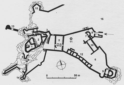 1 - akropola horného hradu, 2 - nádvorie, 3 - zvyšok hranolovej vstupnej veže, 4 - pozdĺžne bašty, 5 - šijová priekopa, 6 - stredný hrad, 7 - obranná bašta, 8 - predbránie, 9 - palác Gorjanskovcov, 10 - palác Báthoryovcov, 11 - studňa, 12 - prevádzková budova, 13 - brána obranného pásma, 14 - strážna vežička (Panenská, alebo Mníška), 15 - delová bašta, 16 - dolný hrad