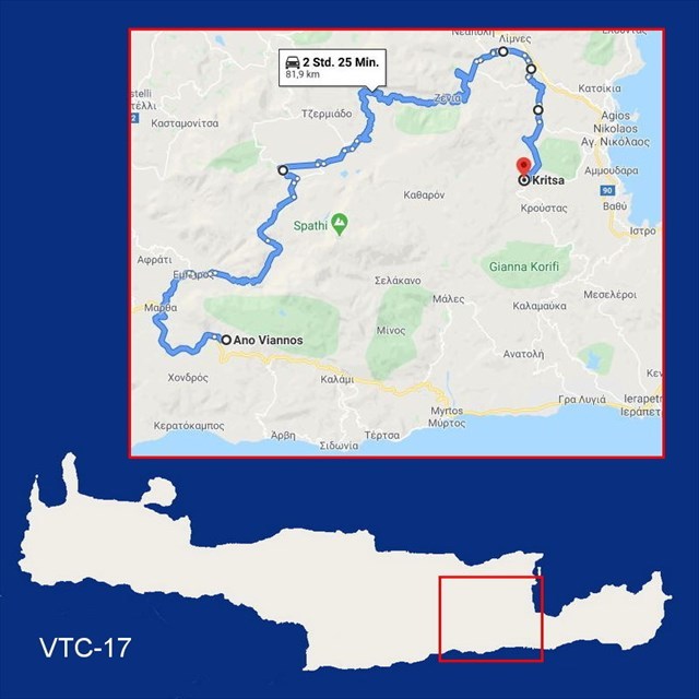 At waypoint E you are going to enter the valley of Exo Lakonia. If you come to Crete yourself to find the boxes of the VTC-series, you will find yourself on the hills to the east of Exo Lakonia, which you can see in the photo.