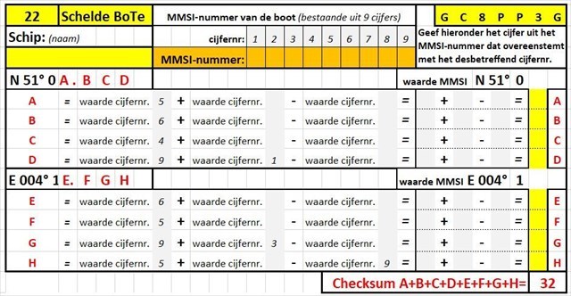 4. Bereken de waarde van de letters A, B, C, D, E, F, G, H, aan de hand van het gevonden MMSI-nummer.