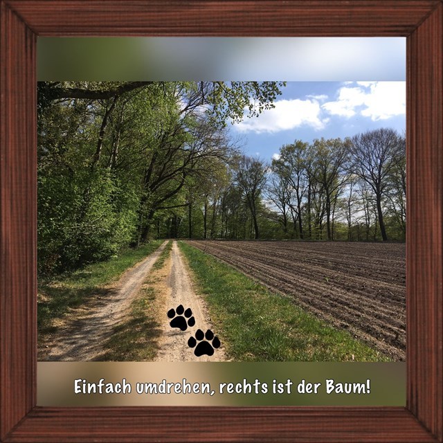 An diesem Scheitelpunkt könnt ihr bei genauer Umschau ein kleines weißes Schild an einer Eiche endecken auf dem eine Zahl und ein Ortname geschrieben stehen. Nehmt hier für den Wert E die Zahl, welche ihr auf dem Schild ablesen könnt. Weiter geht es von hier aus links am Feldrand entlang auf dem kleinen urigen Trampelpfad.