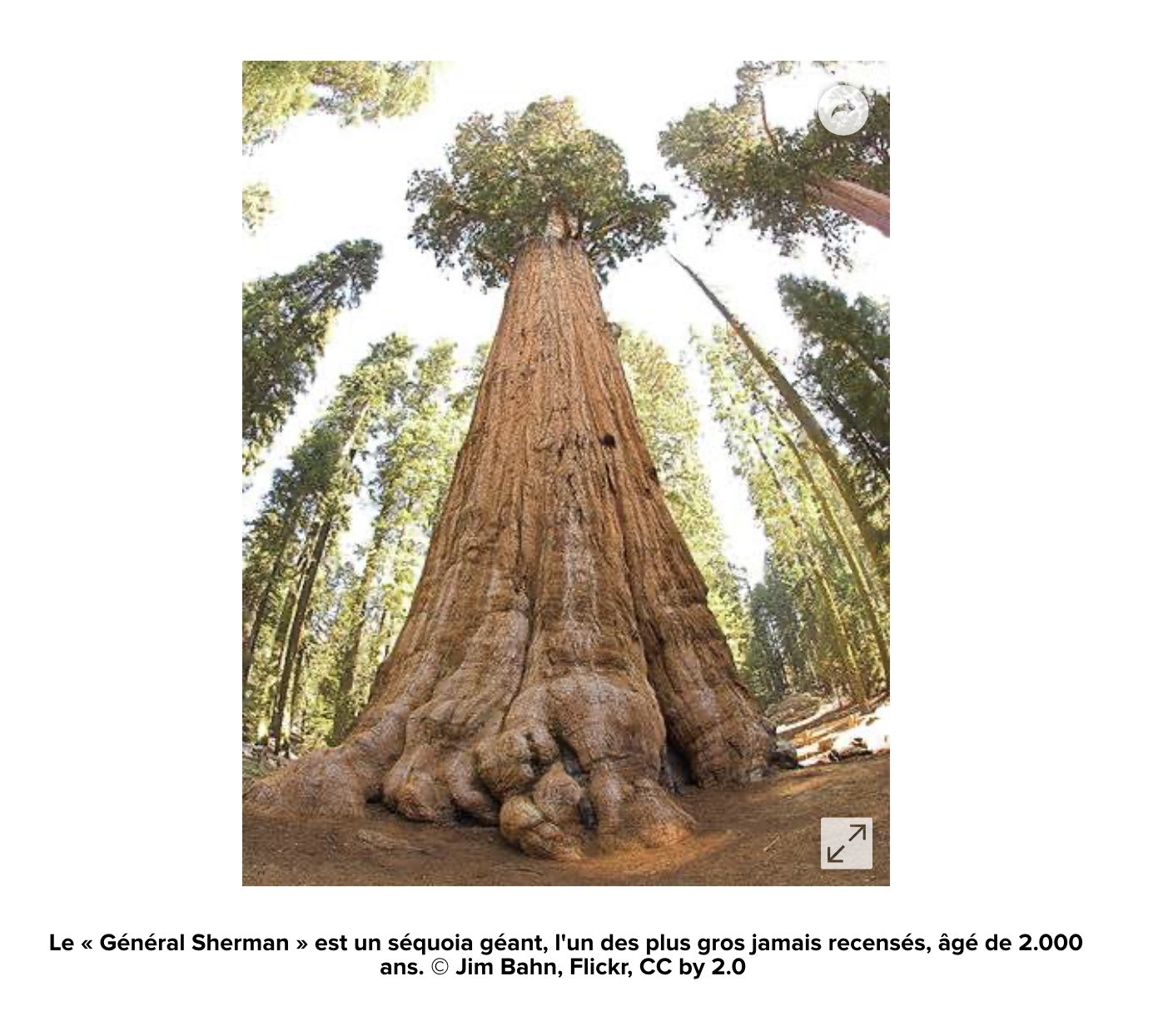 8 - Un séquoia de 2.000 ans Haut de 83 mètres, le « Général Sherman » ne serait pas, quant à lui, le plus grand des séquoias géants (Sequoiadendron giganteum), mais l'un des plus imposants jamais recensés, avec un poids de 1.385 tonnes et un volume de 1.487 m3. Malgré ses vénérables 2.000 ans, l'arbre produit encore chaque année l'équivalent d'un arbre de 18 mètres en volume de bois.