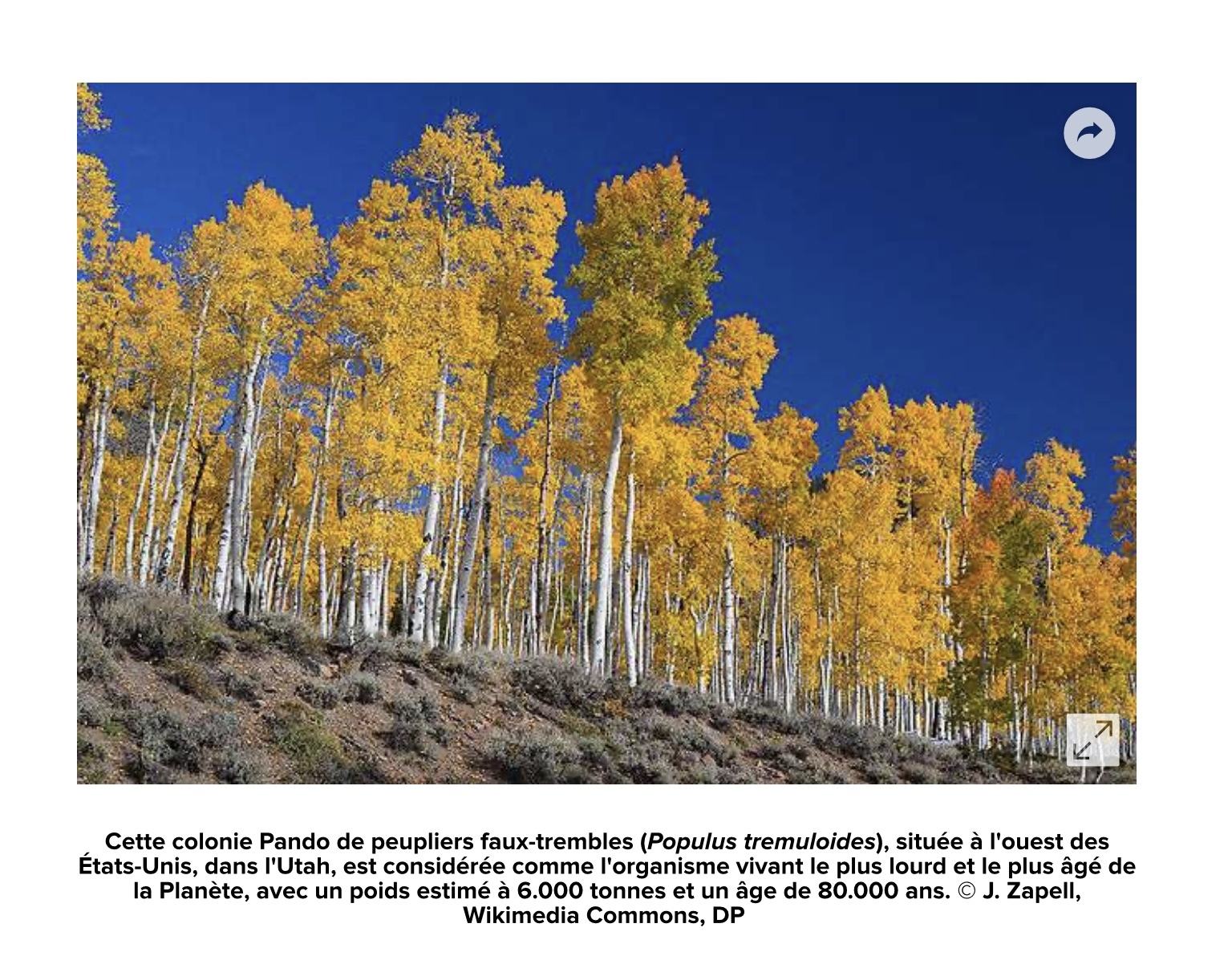1- Pando, âgé de 80.000 ans Signifiant « je m'étends » en latin, Pando serait le plus grand et le plus vieil organisme végétal au monde. Il aurait la forme d'une colonie clonale de peupliers faux-trembles (Populus tremuloides). Située dans l'Utah, aux États-Unis, cette forêt de 43 hectares se compose de 47.000 arbres génétiquement identiques et reliés à un seul et même système racinaire. Si chaque pousse vit environ 130 ans, le système pourrait se régénérer ainsi depuis 80.000 ans. Preuve que l'union fait la force, et parfois, la longévité.