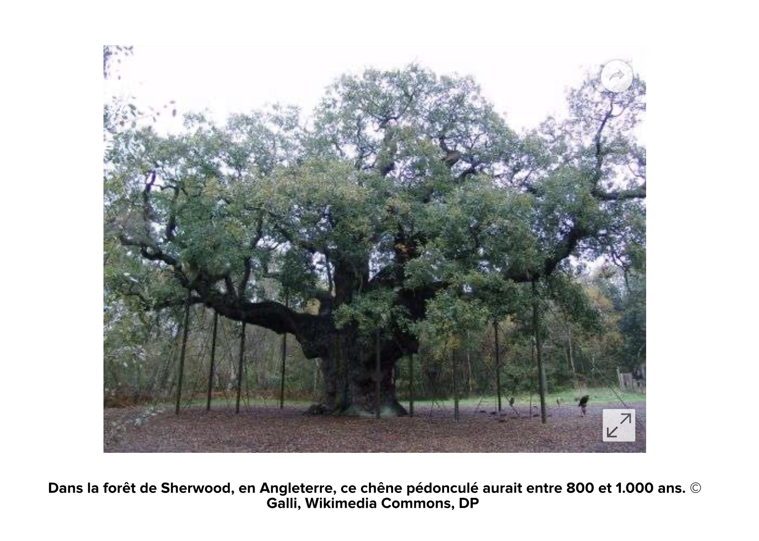 11 - Un chêne pédonculé d'un millénaire Dans une tout autre ambiance, au cœur de la pluvieuse forêt de Sherwood, en Angleterre, le creux d'un chêne pédonculé (Quercus robur) d'une circonférence de plus de 10 mètres aurait servi, au XIIIe siècle, de repère à la troupe de Robin des bois. Âgé de 800 à 1.000 ans, selon les estimations, ce « Major Oak » (littéralement « chêne majeur »), comme il fut appelé, tiendrait sa largesse de la fusion de plusieurs jeunes arbres ou d'un important élagage.
