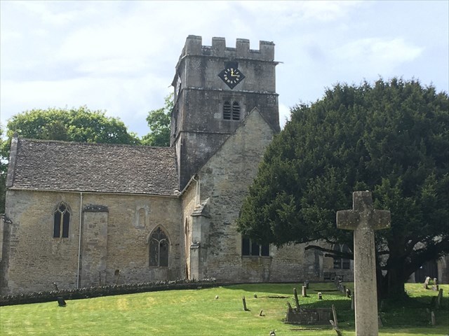 The building was restored in 1902, after part of the tower had collapsed causing damage to part of the nave and north aisle. The Cotswold stone building is cruciform in layout. It has a two-bay north aisle with a porch. The nave has a 14th-century wagon roof. There are parts of the Norman architecture still intact including the doorway, arcade and chancel arch. The three-stage tower is supported by buttresses. The interior includes a table from 1657. There are several monuments and tablets along with a kneeling effigy of Henry Brydges of Avening Court. The stained glass of the East Window is by Clayton and Bell and two in the nave by Christopher Whall.