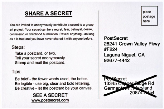 PostSecret is a still-ongoing community art project that was created more than a decade ago in which people mail in their secrets anonymously on homemade postcards. No restrictions were made on the content of the secret; only that it must be completely truthful and must never have been spoken before. Entries range from career disappointments or traumatic experiences to confessions of secret desires, embarrassing habits, hopes and dreams or even extramarital affairs and thoughts of suicide. Sharing your secret was meant to be empowering for those who write them, inspirational to those who read them, and create an anonymous community of acceptance.