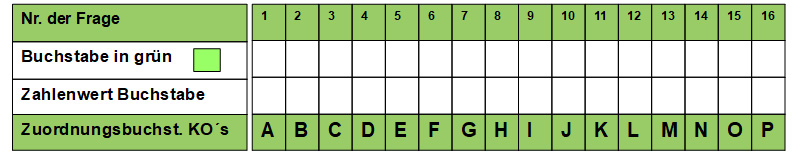 Die grün hinterlegten Felder ordnet ihr nun in der Tabelle der jeweiligen Nummer der Frage zu. Danach errechnet ihr deren Buchstabenwert: