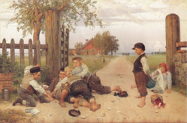 Det har ibland hävdats att stugan i bakgrunden är den nu nedbrunna Rotebro gästgivaregård där Malmström bodde (som låg ett stenkast ifrån denna plats), men så är inte fallet och det är troligare att Malmström målade ur minnet från sitt barndoms Östergötland. (källa: Wikipedia)