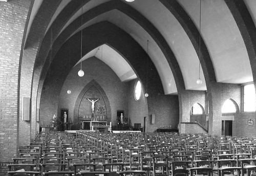 Het interieur is opgebouwd uit zware, bakstenen spitsbogen over een brede middenbeuk.