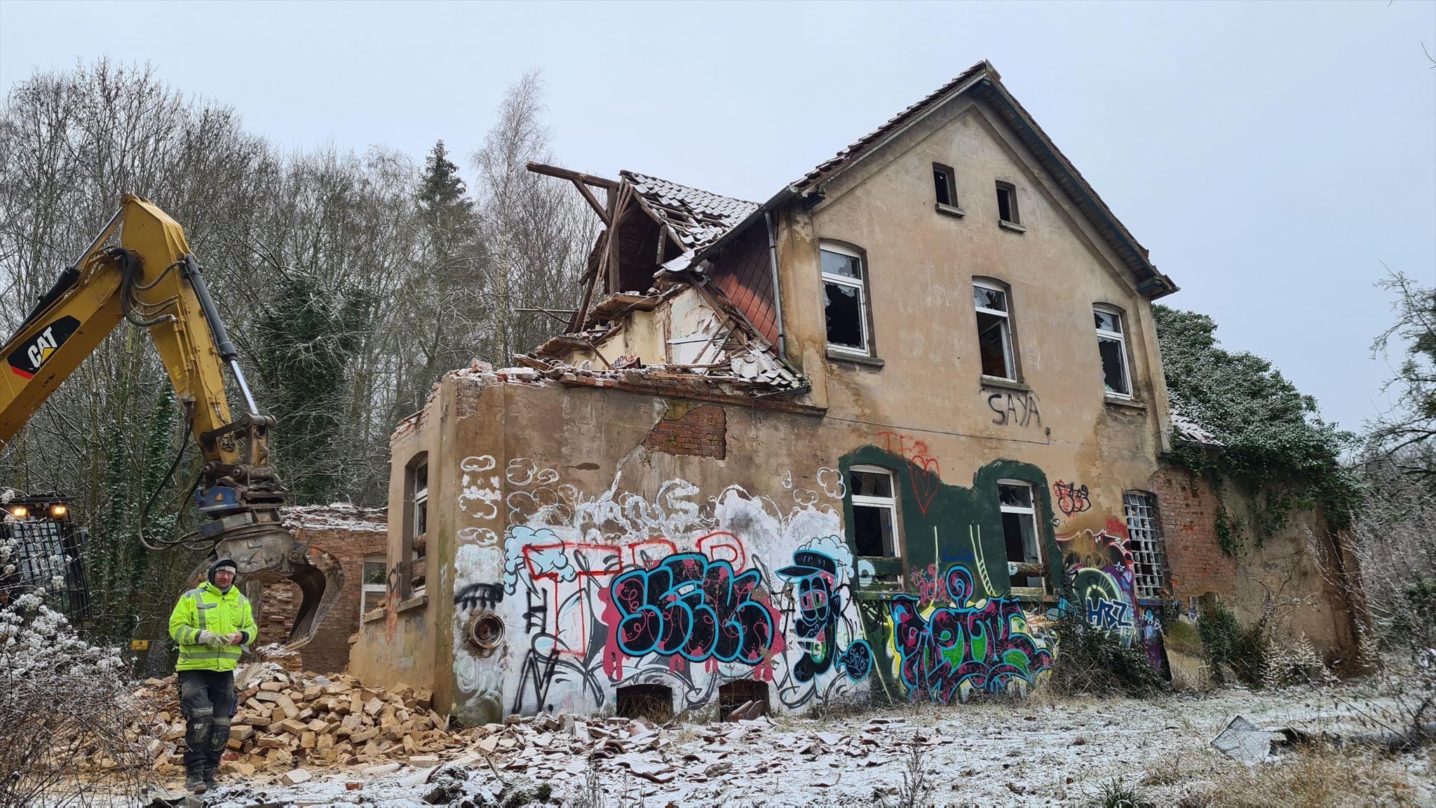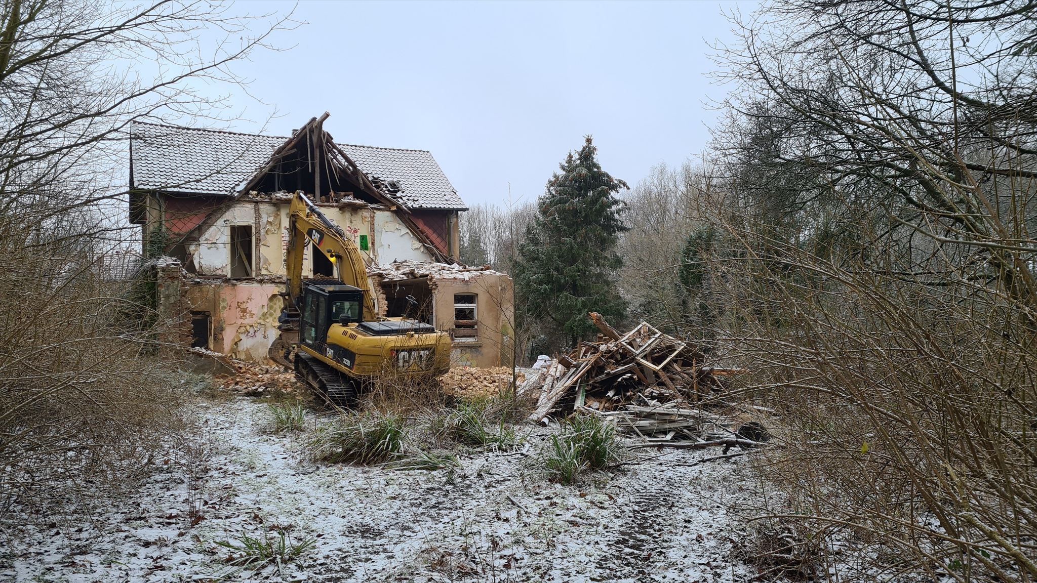 Gestern bekam ich die Nachricht, dass hier auf dem Gelände Abrissarbeiten stattfinden. Also heute morgen gleich den Tatort besucht. Leider hat sich das Schlimmste bewahrheitet. Das Gelände wird platt gemacht. Laut Auskunft eines Bauarbeiters gibt es keinen Käufer für die baufälligen Häuser. Deshalb, und wegen der Einsturzgefahr, lässt die Familie von Knigge die Häuser abreißen und das Gelände im Anschluß wieder aufforsten. Schade um diesen Lost Place. Ich danke für die vielen Favos und hoffe, dass ihr genug Fotos geschossen habt, um das Kalkwerk Bredenbek in Erinnerung zu behalten. Vielleicht gibt das geräumte Gelände ja noch die Möglichkeit für einen Erinnerungscache!