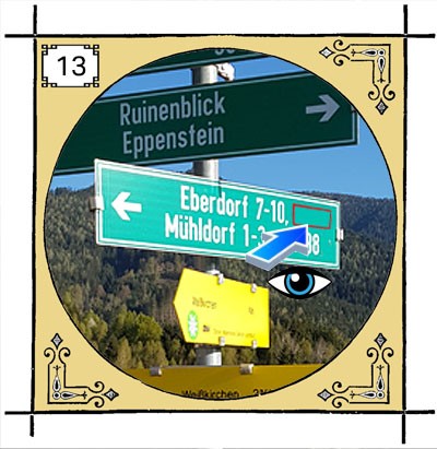 Wegweiser für Eberdorf. Neben den Hausnummern 7-10 steht noch eine weitere Zahl - diese ergibt M.