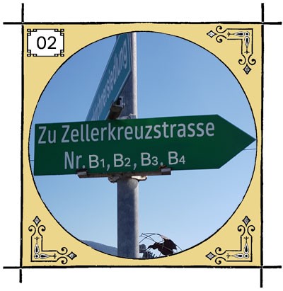 Zellerkreuzstraße... Addiere die vier Hausnummern am grünen Schild - dies ergibt B.