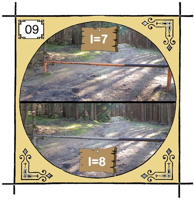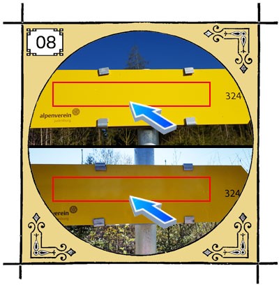 Ihr startet bei einem Wegweiser. Hier sind vier Kilometerangaben zu sehen. Addiert die vier Werte und rundet auf - dies ergibt A.