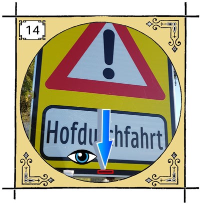 Warnhinweis. Im unteren zentralen Bereich der Tafel steht eine Nummer. Die iterierte Ziffernsumme der Zahl (ohne IT) ergibt N.