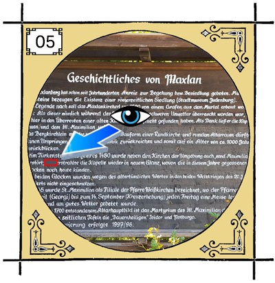 Ihr habt die Maximiliankapelle (auch Maxlan genannt) erreicht. Eine Infotafel gibt euch Auskunft über die Entstehung der Kapelle. Sucht das Jahr, in dem die Kapelle in neuem Glanz erstrahlte. Die Ziffersumme der Jahreszahl ergibt E.