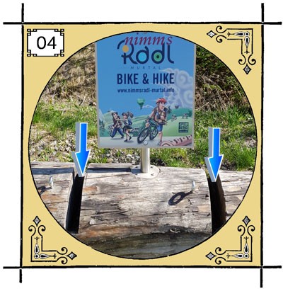 Auch wenn wir bei unserer Wanderung kein Rad gebrauchen können (teilweises Fahrverbot!), kümmert man sich hier in der Region auch um Radfahrer. Wie viele Aufnahmen für Räder sind in dem Baumstamm zu finden? Dies ergibt D.