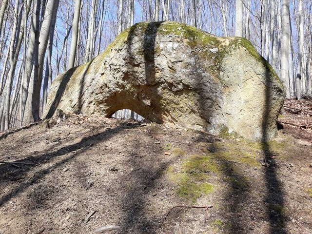 SKALNÍ OKNO. Kousek pod vrcholem bezejmeného kopce se nachází zajímavý, až podivuhodný, cca 2 metry vysoký pískovcový balvan s drobným skalním oknem. Někomu může balvan připomínat třeba i kamenný můstek či skalní branku. Tento přírodní výtvor mají "na svědomí" voda, vítr i mráz, kteří dokáží v chřibských pískovcích úžasně modelovat. Přestože příroda dovede kouzlit, tak je tento útvar v Chřibech docela výjimečný. Skalním oknem lze prolézt, ale doporučuji to zkoušet jen tomu, kdo má postavu přece jen útlejší .... já jsem to zkoušel - neúspěšně. Kousek od Skalního okna lze nalézt i pozůstatky staré lomové činnosti (cca 50 m směrem k jihu). Zde těžený kámen sloužil k opravám lesních cest a k výstavbě opěrných zídek podél nich.
