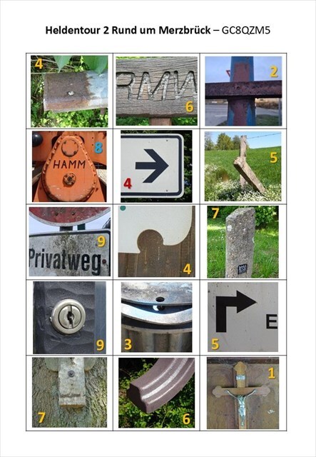 Die Aufgabe ist wenig originell, nämlich die übliche: An allen Wegpunkten findet eines der abgebildeten Fotomotive und ordnet die zugehörige Zahl der jeweiligen Variable zu.