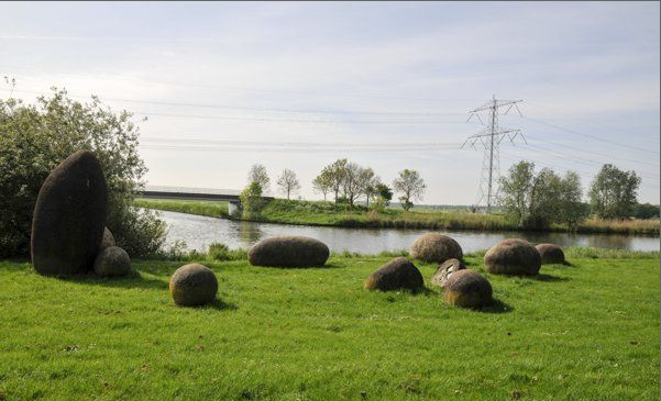 Zo’n 180.000 tot 130.000 jaar geleden was “Flevoland” bedekt door een dikke laag ijs dat afkomstig was van Scandinavische gletsjers. Het ijs voerde grote zwerfkeien met zich mee. Met een tempo van 30 tot 100 meter per jaar hebben deze stenen een afstand van zo’n 1200 kilometer afgelegd voordat de ijsmassa hier, tot rust kwam. Daar hebben de keien duizenden jaren onder water gelegen. Tijdens de drooglegging van Flevoland kwamen de zwerfkeien letterlijk weer boven water. Dit is de inspiratiebron geweest bij het ontwerpen van het kunstwerk “Vondst”, verborgen schatten op de bodem van de zee. De 10 liggende en staande zwerfkeien zijn gemaakt van gegoten beton. Eén van de keien is doorgezaagd en heeft een metalen kern. Zwerfkeien, gemaakt door mensen handen net als het omringende Flevoland.