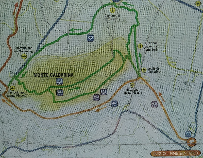 La seconda variante prevede la svolta a destra al termine della salita del versante sud del Calbarina, tra un'interessante vegetazione campestre e spontanea. Poco dopo, si segue la direzione per l'area umida di Corte Borin; il bosco è più fitto con sottobosco caratterizzato da edera e pungitopo. La discesa sbuca nell'area di sosta presso lo stagno. Il cammino riprende seguendo il sentiero sul piano della campagna, costeggiando campi e noccioli e, dopo leggera salita, la piazzola recintata di via Mondonego. Prosegue entrando in un boschetto di gelso della Cina, seguito da ampi spazi aperti. La radura successiva è un vegro calcareo dove in primavera fioriscono numerose specie di orchidee; lungo il sentiero in salita prevalgono arbusti di rosa canina e scotano con frassino, roverella, acacia, ailanto e carpino nero. All'imbocco del bosco, nei pressi di una panchina, compaiono alcuni lecci, mentre poco oltre inizia l'area del rimboschimento a pino nero.