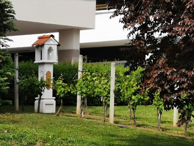 Od kešky je vyhlídka na vinohrad i boží muka z roku 2009, zdobená z přední strany plastikou sv. Urbana.