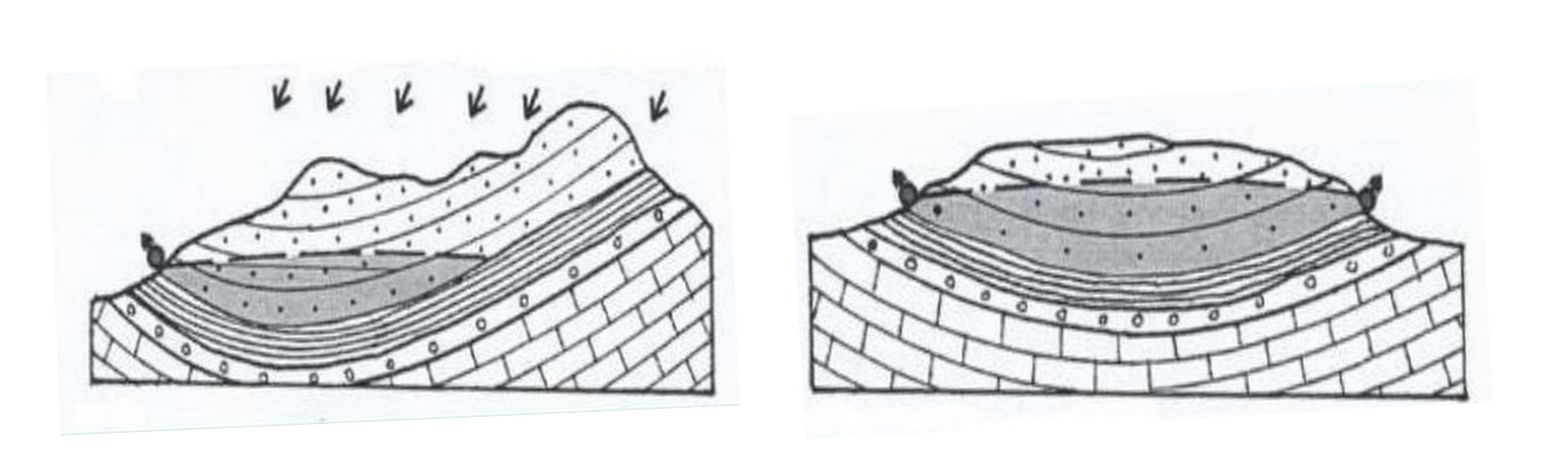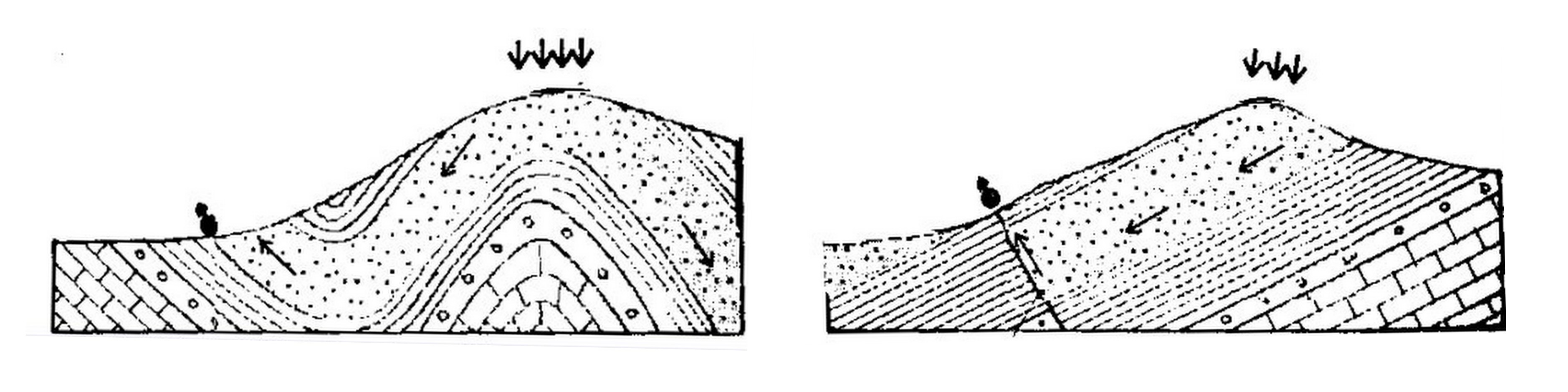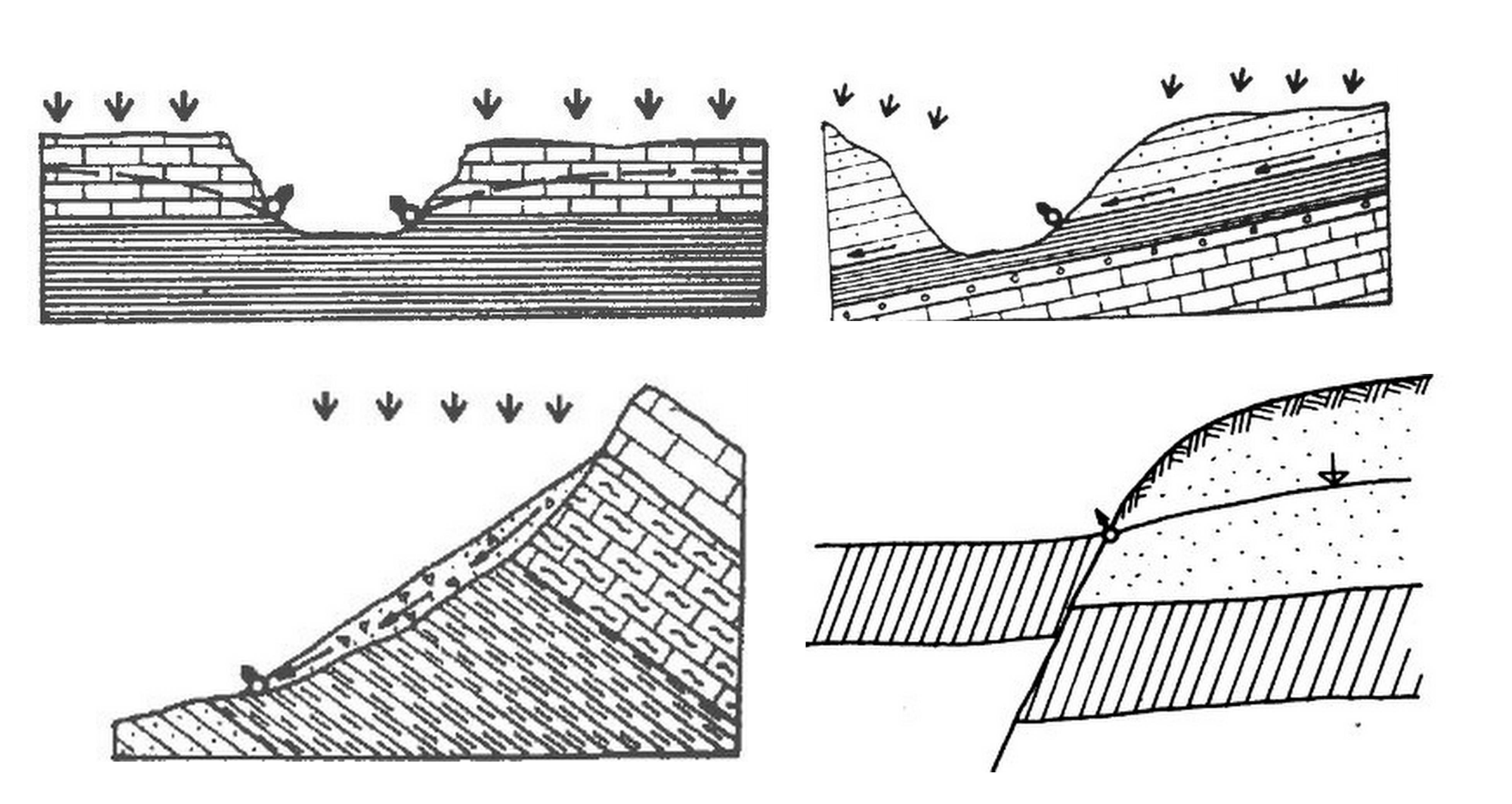 -vystupujú na zemský povrch v synklinálnych –misovitých štruktúrach a prelievajú sa cez okraj týchto štruktúr na kontakte priepustných a nepriepustných hornín