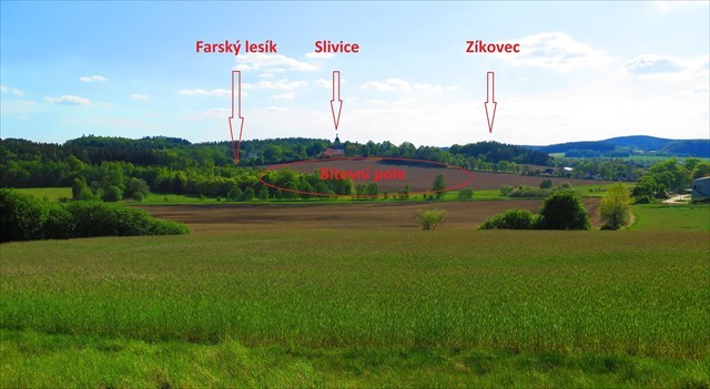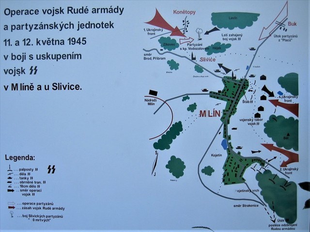 Když se v Příbrami rozkřiklo, že se Rudá armáda blíží k městu, vydala se iniciativní partyzánská skupina přes Lešetice k Slivici, s představou, že zde u Milína pomůže odzbrojit zadní voj ustupující německé armády. Částečně se sice jednalo o partyzány ze skupiny „Smrt fašismu“ kapitána Olesinského s jistými zkušenostmi z boje, ale u členů revoluční národní gardy už to tak slavné nebylo. A když se k nim během cesty přidávali místní a v literatuře povšechně zmiňovaní „horkokrevní mladící ze Slivice“, převládlo zjevně nadšení nad opatrností a ostražitostí. Na místo dorazili v odpoledních hodinách a v okamžiku, kdy se dostali do palebného pásma nepřítele, byli pro něj pohodlnými terči a zaznamenali tak citelné ztráty. Od kraje lesa za pomníkem na Slivici, se můžeme rozhlédnout na část bitevního pole. V pozadí vidíme zalesněný Levín a pod ním cestu mezi poli, po které jsme přišli. Po pravé ruce nejbližším lesíkem je Farský lesík. Tady všude se bojovalo...