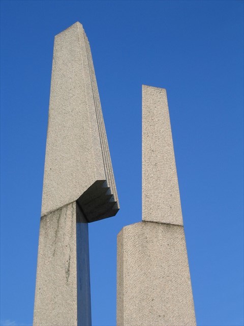 Akademický architekt Václava Hilský a akademický sochař Viktor Dobrovolný vyhráli se svým projektem soutěž a podle něj byl v roce 1970 postaven památník, který tu dnes vidíme. Pětiúhelníkové plato z benátské dlažby s dominujícími dvěma pylony ze světlé liberecké žuly o výšce 10,5 a 11 metrů…