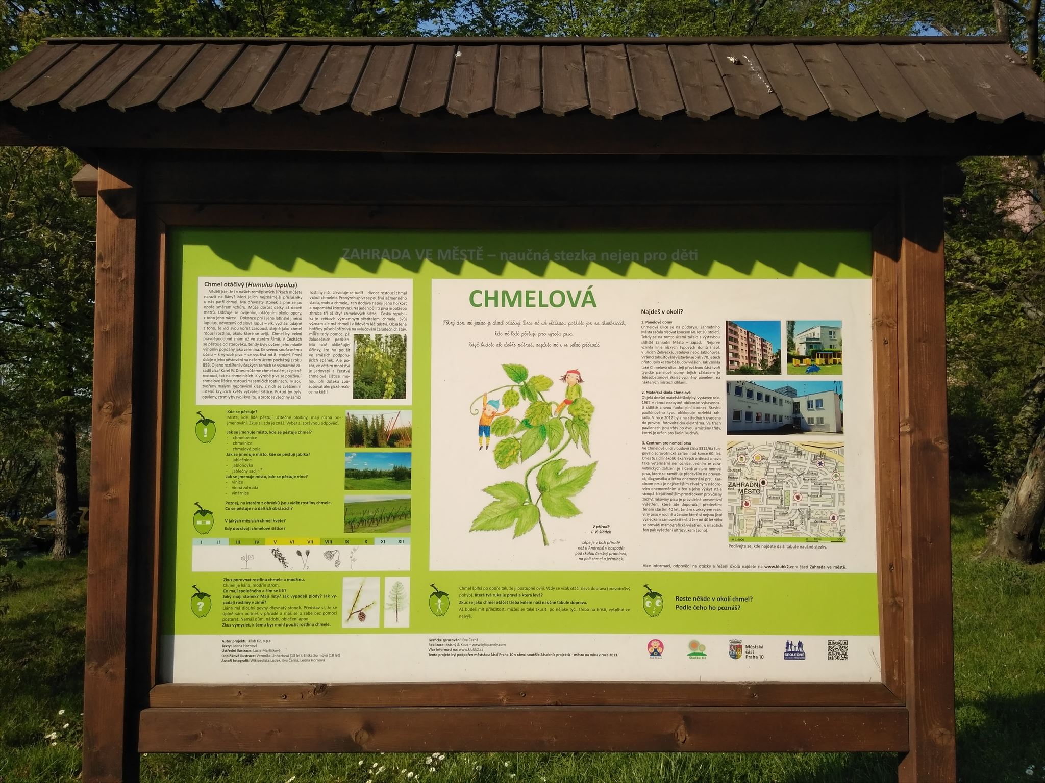 Naučná stezka na Zahradním Městě vzniká od roku 2012. Jejími realizátory je Klub K2 a stezku finančně podporuje Městská část Praha 10 v rámci Zásobníku projektů. Na každé naučné tabuli najdete zajímavosti z říše rostlin, ale také informace o dané lokalitě. Poučí se i dospělí, tabule ale obsahují především hodně úkolů a námětů pro děti. Možná vás zavede do míst, která jste dosud neznali, tato čtvrť má svůj osobitý půvab.