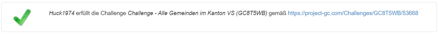 1. Du musst in jeder Gemeinde des Kantons Wallis je mindestens einen Cache gefunden haben, BEVOR du diesen Cache als gefunden loggen darfst (dieser Cache kann daher nicht mitgezählt werden).