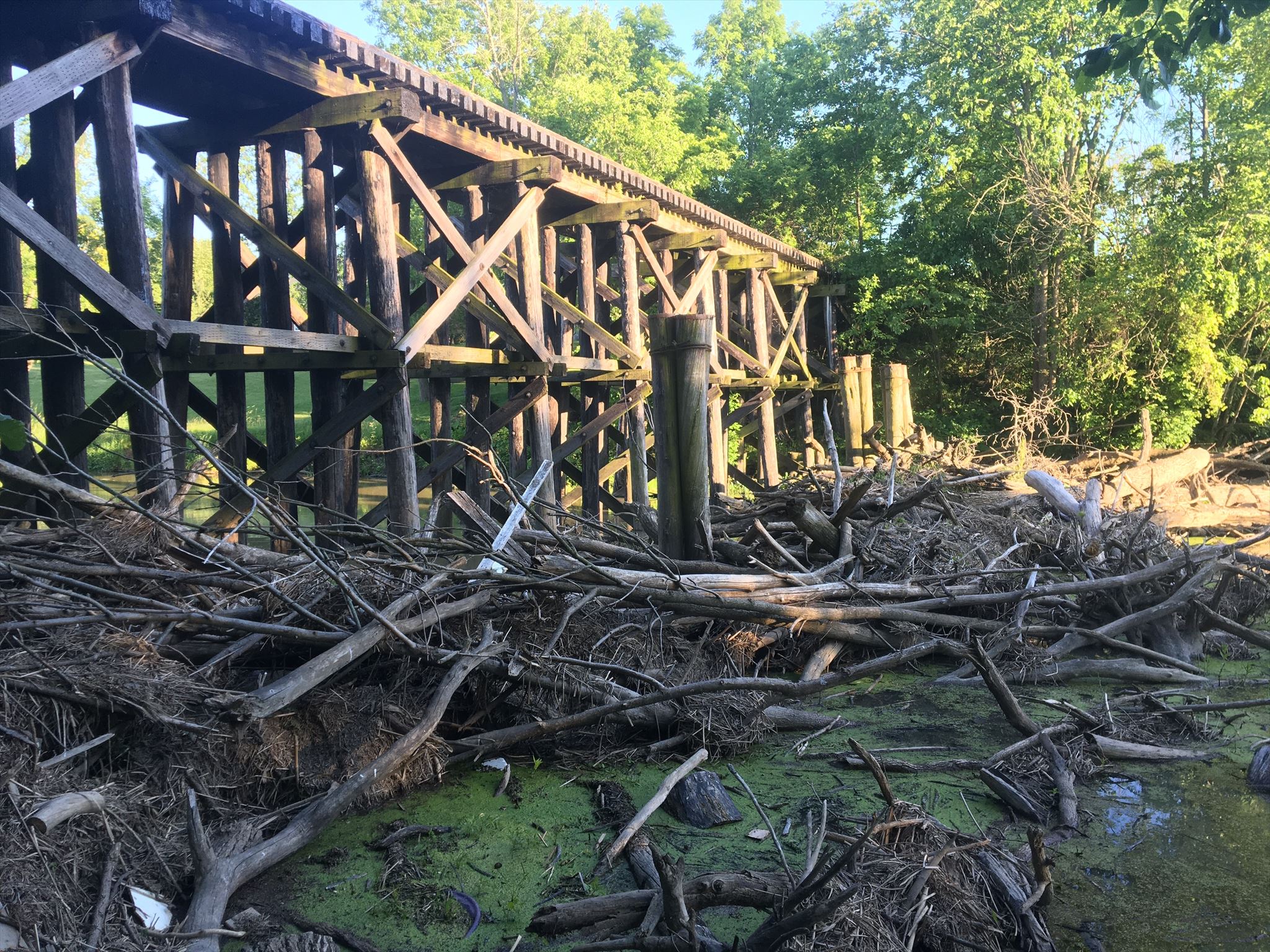 At the time when the caches were placed there was a giant log jam 4 caches down the river from Robert Land launch area at the old train bridge between GC8V5HV "C" Welland River Paddle and GC8T724 #1 Welland River Paddle. We portaged around it with a canoe and two kayaks in about half an hour. Picture below.