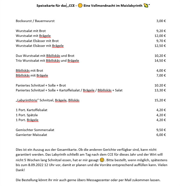 In der Bewirtungshütte wird eine kleine Speisekarte (siehe Anhang) angeboten. Um planen zu können, möchte ich Euch bitten, Eure Essenwünsche bis zum 08.09.2022 12:00 Uhr mir mitzuteilen (Message, Mail ...). Bitte gebt auch bei der Anmeldung auch an, mit wie vielen Personen Ihr kommen werdet.