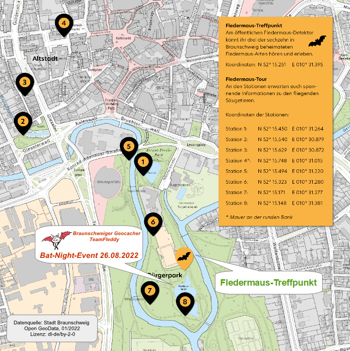 Vor Ort könnt ihr durch unser Team näheres über unseren Multi-Cache „Crazy Fleddy“ erfahren, oder auch schon in der Umgebung die eine oder andere Station der „Fledermaus-Tour“ zu besuchen, um die Rätsel zu lösen. Wer will, kann sich natürlich auch auf die gesamte Tour über 8 Stationen von ca. 3,5 km (zu Fuß ungefähr 2 bis 2,5 Stunden) begeben.