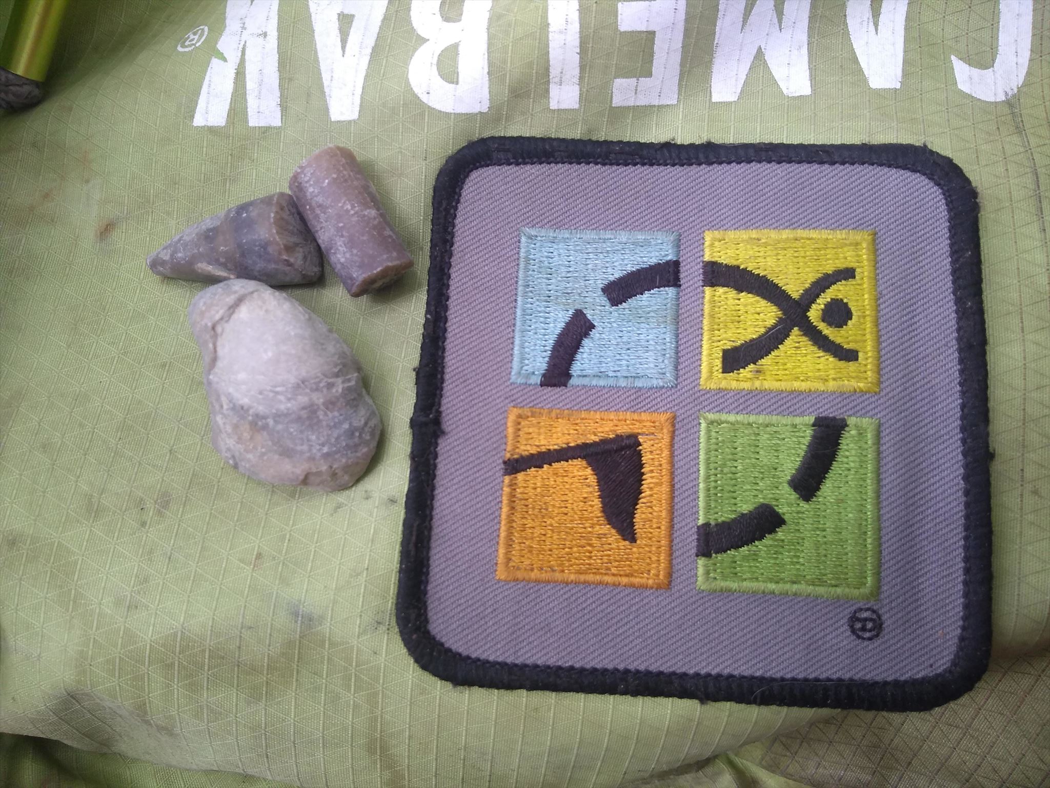 These fossils were collected on Sheep Mountain in Wyoming on a geology field trip. Belemnite is an extinct squid-like animal which lived between roughtly 230 and 70 million years ago. The belemnite fossils in this cache are small, cylindrical rocks, a few of which taper to a point at the end. Devil's Toenail is the common name for an extinct variety of oyster which lived during the same time period. These fossilized shells look like giant toenails or talons. There is only one of these fossils in this cache, so please don't take it! In the picture below, the two fossils on the top are belemnite; the fossil on the bottom is devil's toenail.