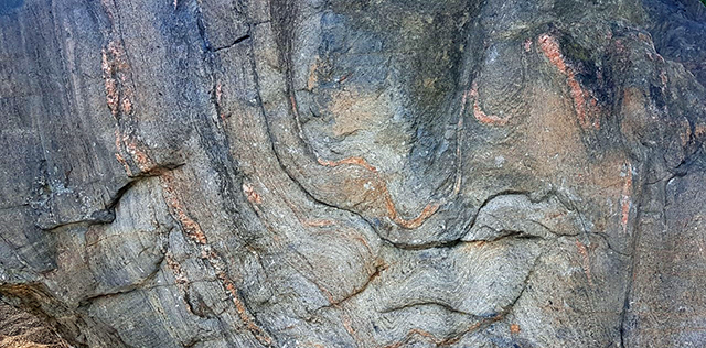 Dieser Effekt ist mit bloßem Auge auf der Oberfläche des Gesteins (Findlings) zu sehen. Hier an diesem Findling haben wir nur einen sehr kleinen Ausschnitt dieser komplexen Gesteinsbildung vor Augen.