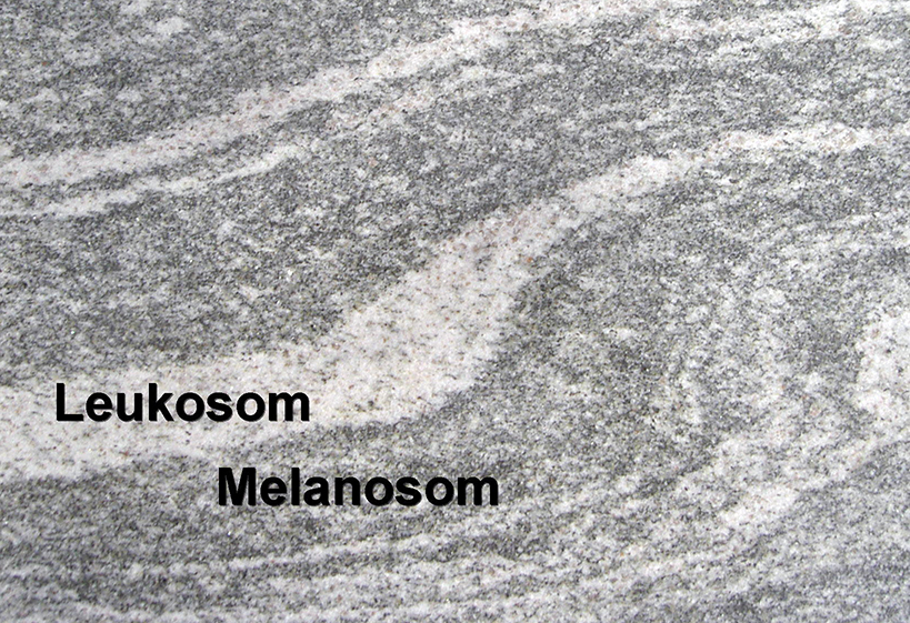 Derjenige Anteil des Migmatits, der nicht der partiellen Aufschmelzung unterlag, wird allgemein auch als Paläosom bezeichnet. Es ist reich an Quarz und Feldspäten und damit von heller Farbe, nennt man es Leukosiom. Hat es eine dunkle Färbung und ist damit reich an Cordierit, Biotit und Hornblende, nennt man es Melanosom.