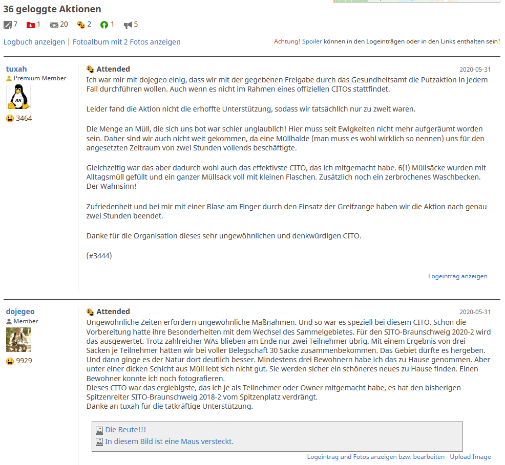 Nun zum Hintergrund: Am 2020-05-31 - es war ein Pfingstsonntag - fand unter besonderen Umständen das SITO-Braunschweig 2020-1 statt. Genauer gesagt, fand die zugehörige Müllsammelaktion statt. Zwei Teilnehmer (tuxah und dojegeo) waren von 37 Interessenten übrig geblieben. Die beiden machten sich um 10:00 Uhr ans Werk. Nach zwei Stunden waren sechs Müllsäcke mit diversem Abfall gefüllt und ein Müllsack war halb voll kleiner Glasflaschen (0,1 l und kleiner), die auch als Flachmänner bezeichnet werden. Mehr war der Stabilität des Müllsacks auch nicht zuzumuten. Daraus ergab sich eine Sammelmenge von 3,25 Säcken je Teilnehmer. An einem "erfolgreicheren" CITO habe ich bisher nie teilgenommen. Auch ist mir keines bekannt.
