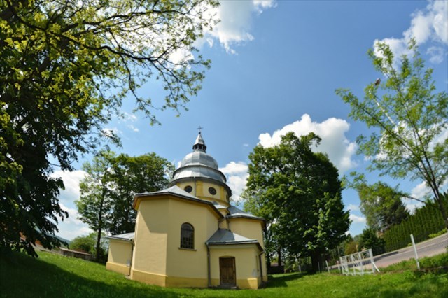 zbudowana na planie krzyża rzymskiego, łącząca cechy stylu ukraińskiego i polskiego.