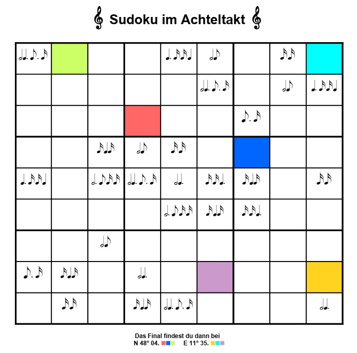 Nachdem vielen von euch das Viertelnoten-Sudoku GC8KNEB so viel Spaß gemacht hat, wollen wir euch das Neuner-Noten-Sudoku nicht vorenthalten. Es ist natürlich ein wenig schwieriger als das Viertelnoten-Sudoku, schon allein deshalb, weil hier neun verschiedene Ziffern einzutragen sind.