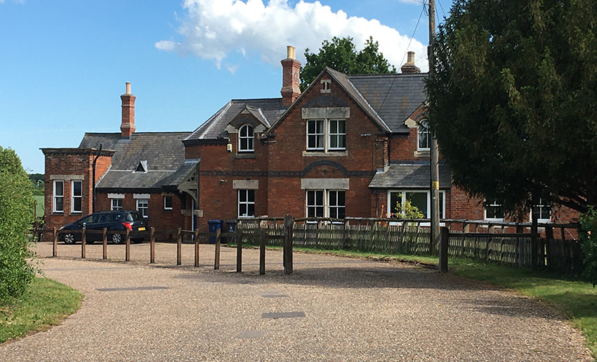 The main station buildings in 2020, viewed from the direction of the main A1198 road: