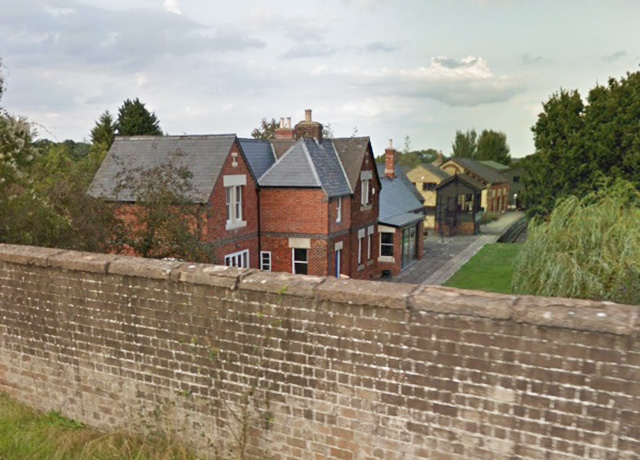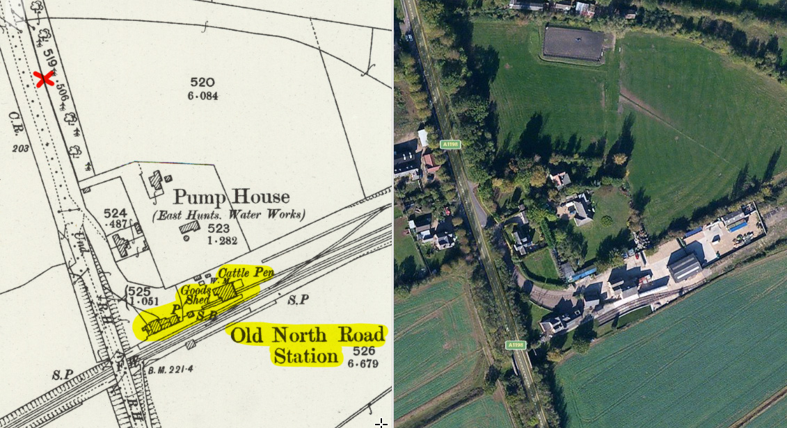 The aerial view shows (on the map) where the station was situated and X marks the cache position. The building layout today is very similar, but the track that can be seen (on the photograph) has been re-laid: