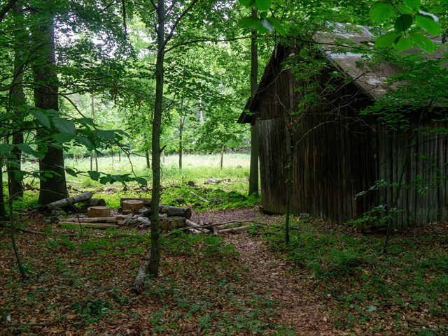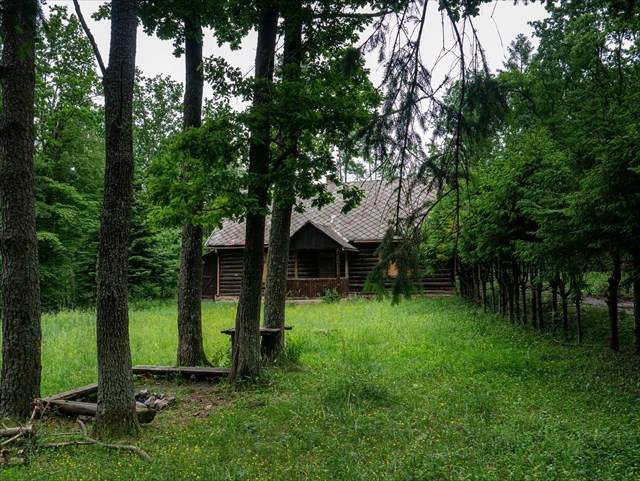 uzamknutá chata, kde sa dá prespať na verande, v okolie je trávnaté priestranstvá |