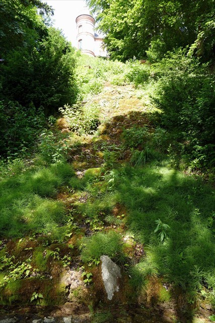 Interessant ist nicht nur die Quelle selbst sondern auch der Abfluss des nicht genutzten Wassers. Es sickert nämlich am Hang des alten Steilufers hinab zum Schweriner See. Dabei werden die dort wachsenden Laubmoose von Kalk überkrustet.