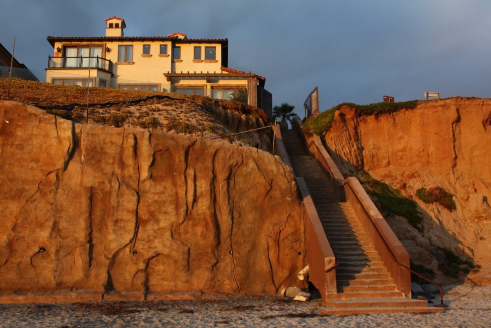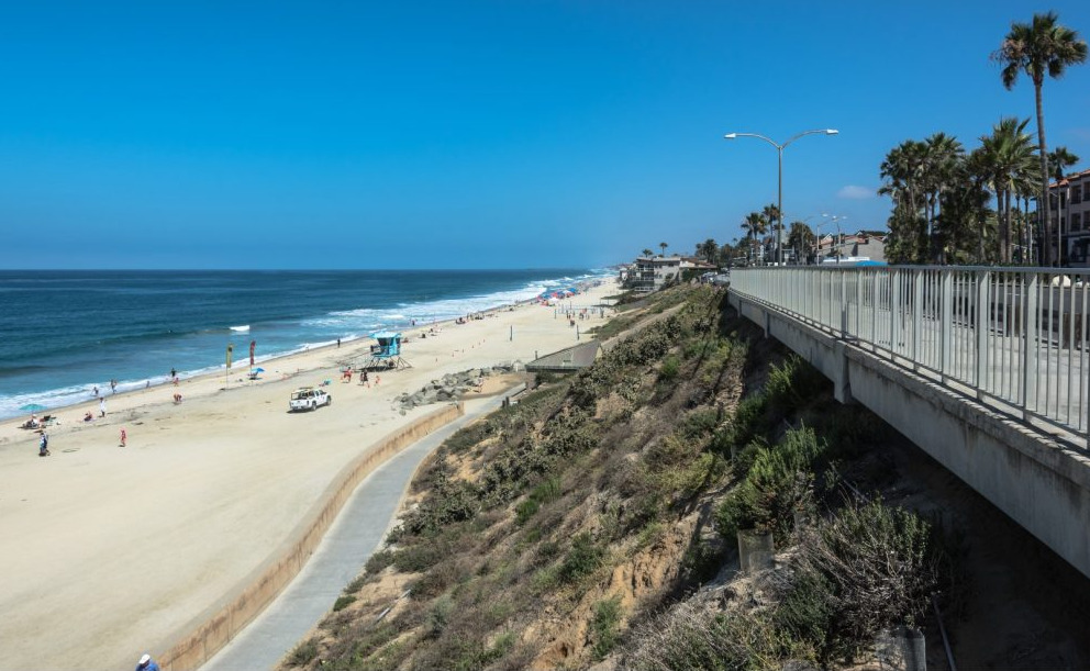 Robert Frazee State Beach is one of several great beaches within Carlsbad State Beach. There is ramp access from the intersection of Pine Avenue and Carlsbad Boulevard . The often full parking lot at Oak Avenue and Ocean Street gives access to a small grass park with benches looking out over the ocean and the Pine Ave ramp. This beach is similar to Tamarack Beach to the south, but it’s less crowded. Between these two beaches is a beach promenade walkway on a seawall below the bluff. This is a great walk or running route and you can return on the sidewalk of Carlsbad Blvd to make a loop. The beach at Frazee is wide and sandy. North of the parking lot the state beach continues in front of homes and condos and it lacks lifeguards and facilities.
