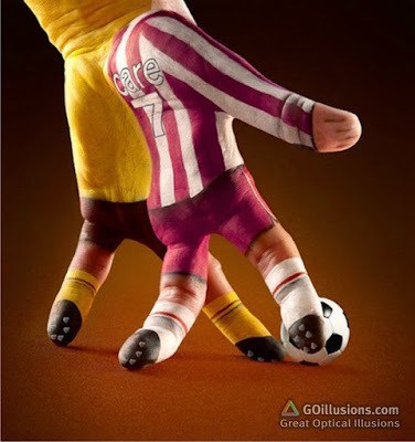 This illusion is created by the way his hand has been cleverly painted. At first glance it looks like 2 soccer players.