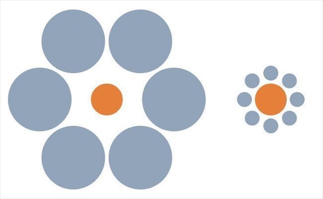 Yep, your brain sucks again. The orange circles are exactly the same. This is known as the Ebbinghaus illusion. It is theorized that the two main visual contributors to this illusion are the difference in the distance between the outer ring and inner circles as well as the completeness of the ring surrounding the "smaller" circle.