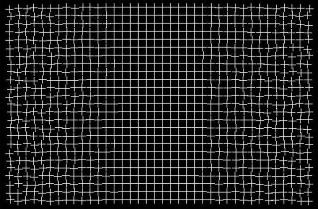 This would be a perfectly nice grid, except it's all crazy and disjointed on the sides. If only there was a way to fix it! There is! Sort of! If you stare at the center of the grid, the crazy peripheries begin to fix themselves. It is thought that the brain has a bias towards order and regular patterns and will actually go about "fixing" the problems on the sides.