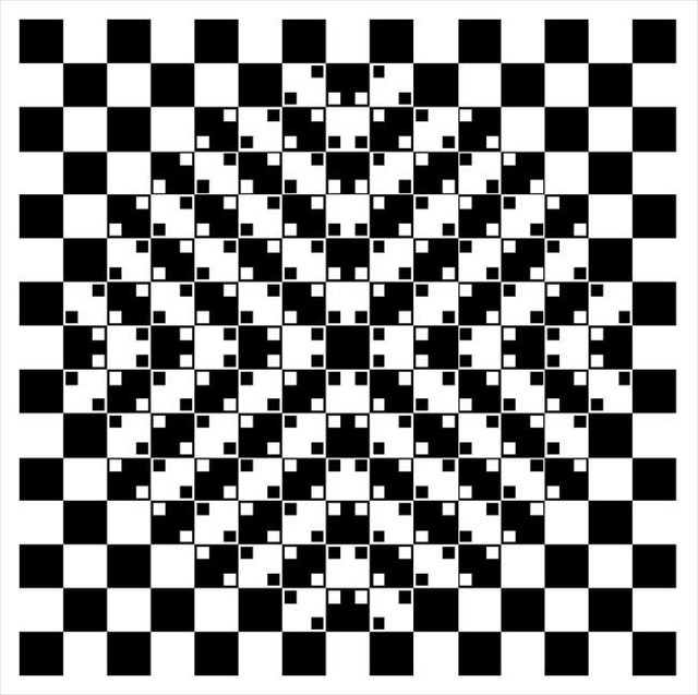The blocks appear to be bulging out, but in fact that’s only an illusion, as they are all straight and it’s the placement of the black and white squares inside the bigger squares that create this illusion. The lines between the squares are actually straight