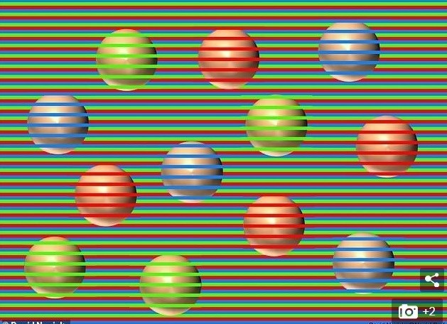 Here are 2 pictures of golden balls, the balls are exactly the same colour, it’s the coloured lines passing through them that creates this illusion.